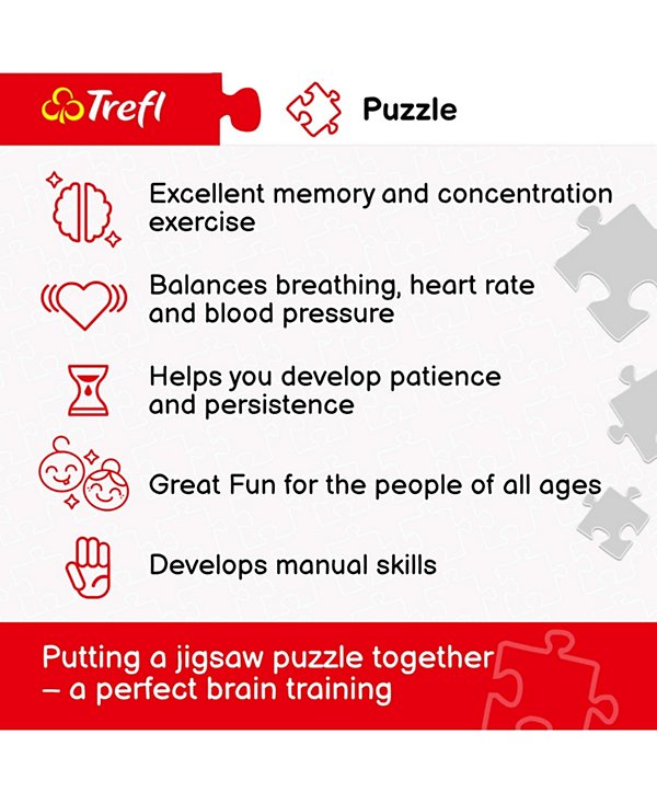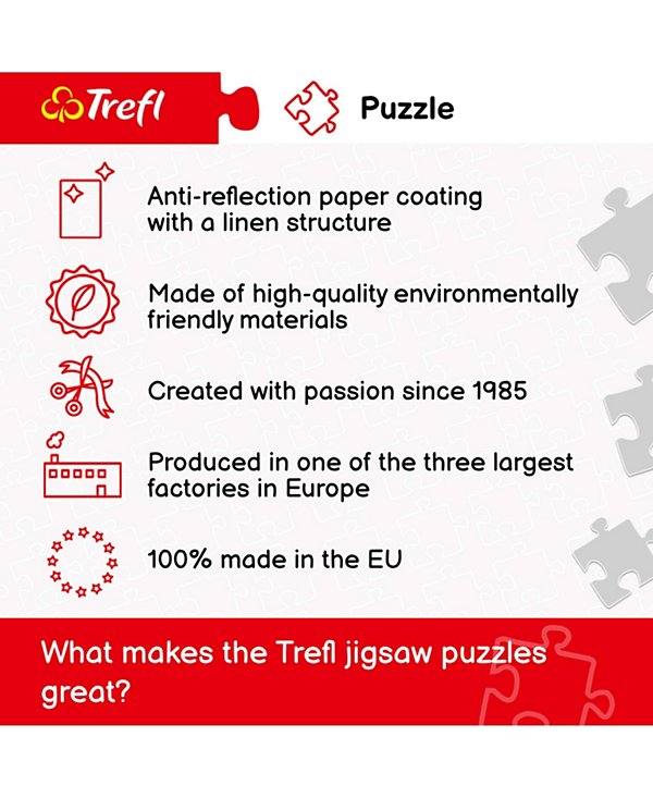 Trying to arrange a nice evening at home? Jigsaw puzzles are a great way to spend your free time with friends and family, at the same time providing you with a great brain exercise. They also make for a perfect birthday or Christmas gift. Trefl jigsaw puzzles are produced in Poland using natural materials only. The special paper with a flax fiber structure reduces the light reflection and makes them easy to use, giving you even more joy. 1000 pieces puzzle. Perfect for puzzle lovers.